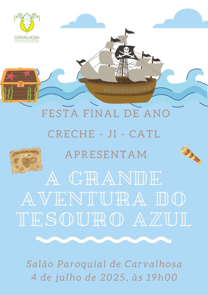 No dia 4 de julho de 2025, o Centro Social e Paroquial de Carvalhosa celebrou a Festa de Final de Ano da Creche, Jardim de Infância e CATL, com um espetáculo encantador: “A Grande Aventura do Tesouro Azul”.