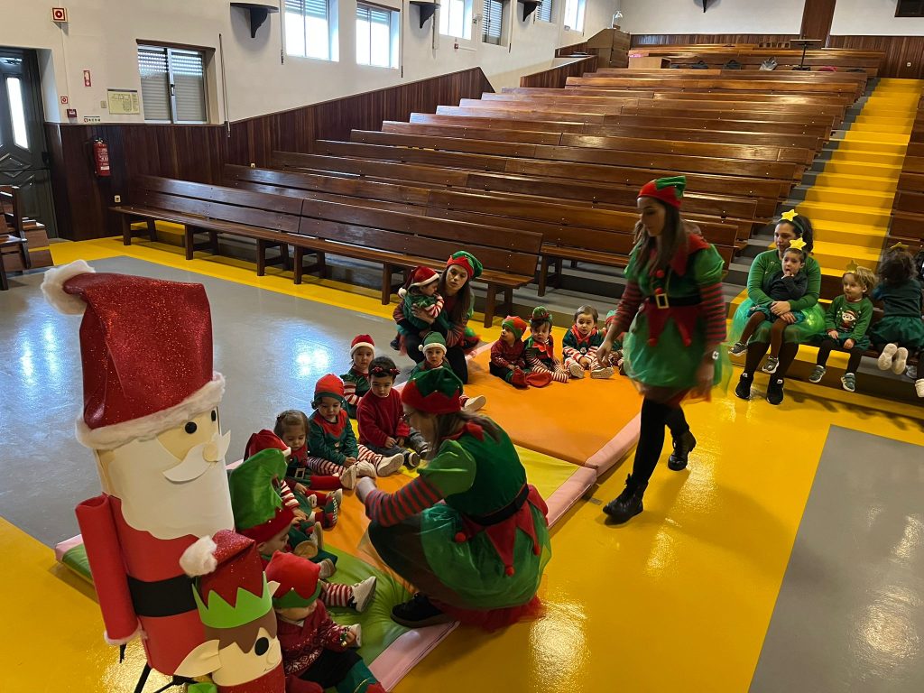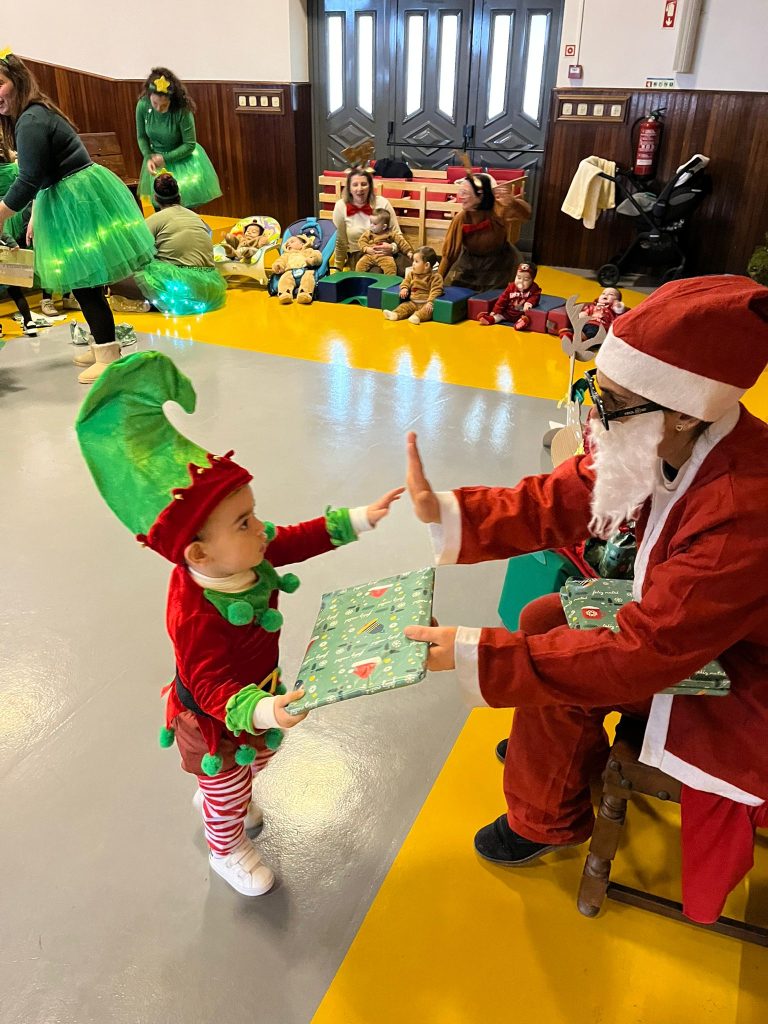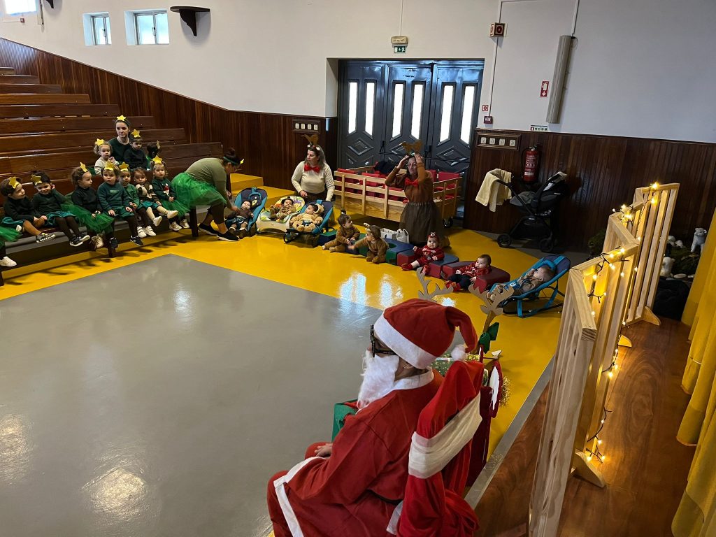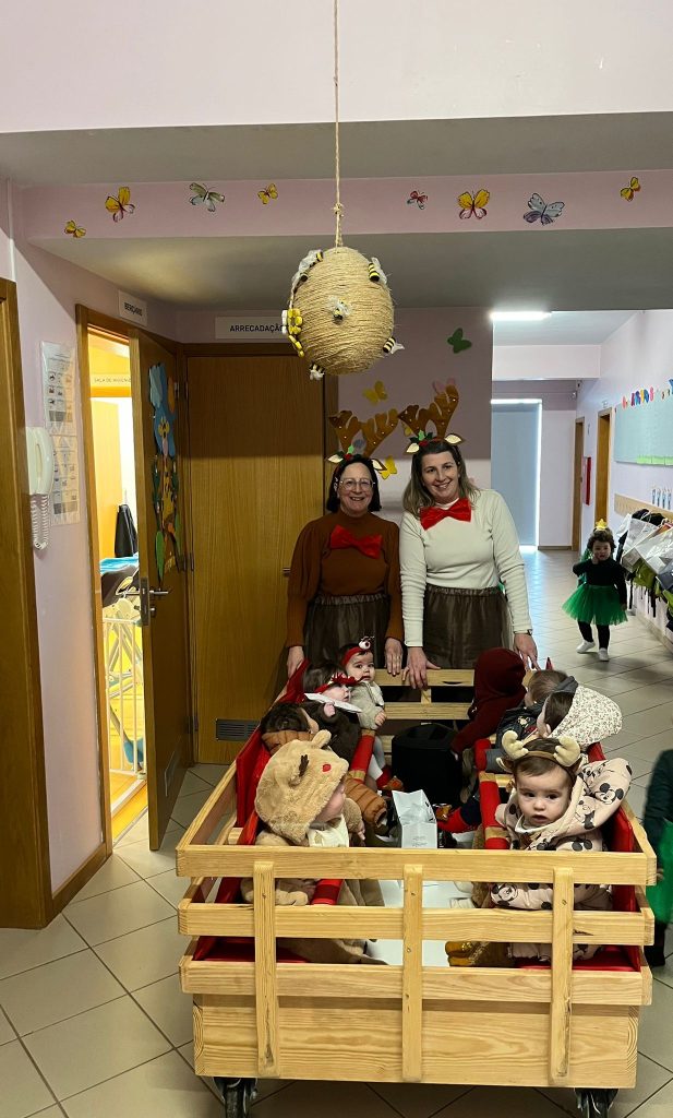 A alegria voltou a borbulhar com a chegada eufórica do Pai Natal no seu trator cheio de prendas. Cada sala da creche presenteou o Pai Natal com uma atuação, estando vestidos a preceito.